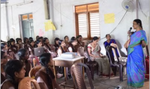 Cheyyur Government Girls Higher Secondary School girls are listening to Thenmozhi briefing them about opportunities in Sarva Vidya through the 'Empower to Enable' programmes. As a routine all the briefings are done directly and no advertisements are resorted to.